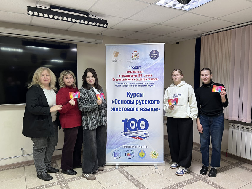 В рамках реализации проекта были проведены курсы по основам русского жестового языка, которые проводились на базе Регионального ресурсного центра по поддержке добровольчества (волонтёрства) Смоленской области, по адресу: г. Смоленск, ул.М.Расковой, д. 11 А, 1 этаж и в офисе Смоленского РО ОООИ ВОГ по адресу: г. Смоленск, Тульский переулок, д. 10. С 3 сентября по 24 октября 2025 года было проведено 20 занятий на 72 ак. часа для 17 слушателей под руководством преподавателя РЖЯ Масленнковой Т.И. Темы курсов: «Семья Дом. Здоровье. Учеба», « Числа и счет. Общие употребляемые слова. Календарь и время», «Одежда. Обувь. Головные уборы.», «Человек. Внешний вид. Чувства», « Спорт. Медицина. Власть. Общество.» и др. позволили дать слушателям базовые знания по РЖЯ. Проведение практикумов с носителями РЖЯ (глухими и слабослышащими) позволили слушателям курсов пройти практику и применить полученные знания, что позволило максимально усвоить особенности общения с глухими, узнать их культуру поведения, максимально точно владеть жестами и научиться понимать лиц с нарушением слуха, т.е. стать их проводником в мир звуков. Группа была сформирована из специалистов СОГБУ «Реабилитационный центр для детей и подростков с ограниченными возможностями «Вишенки», ОГБОУ «Педагогический колледж», ОГБУ "Смоленский КЦСОН", родителя ребенка с нарушением слуха и др. Организация курсов «Основы русского жестового языка» для слышащих смолян позволила обучить 14 добровольцев базовым основам РЖЯ. Обучение основам РЖЯ позволило снять барьеры в коммуникациях между глухими и слышащими людьми, научило глухих и слышащих взаимодействовать друг с другом, находить разные способы коммуникации.
